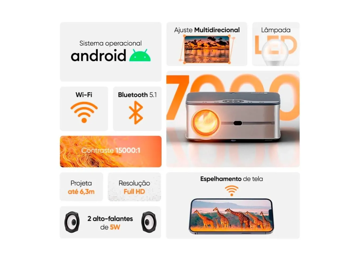 Projetor Multimídia Goldentec 7000 Lúmens Full HD com Android, HDMI, USB, AV é ideal para realizar projeções até 250", conta com resolução Full HD 1920*1080p e 7000 lúmens!