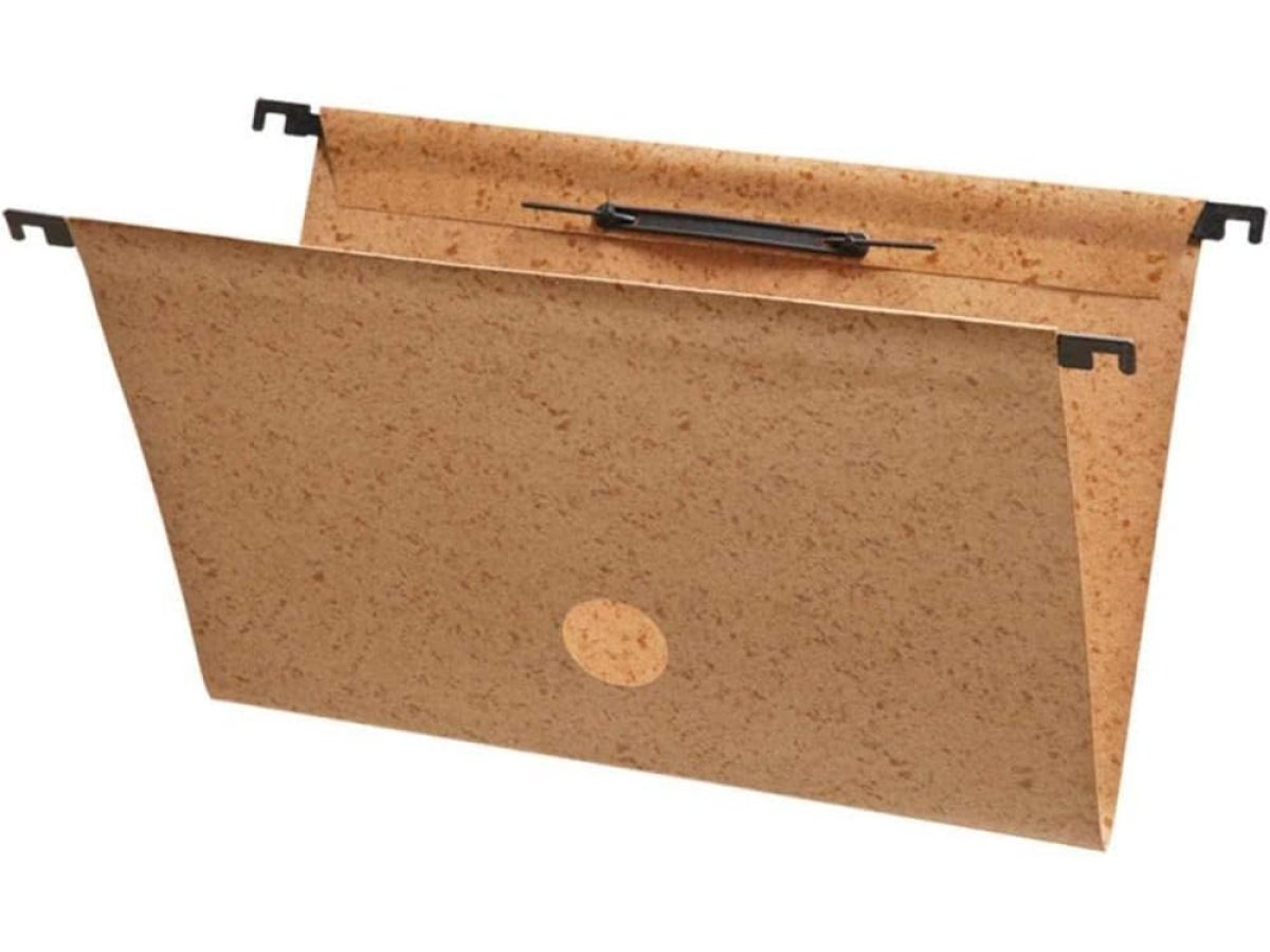 Pasta suspensa com o corpo em cartão kraft e haste plástica.